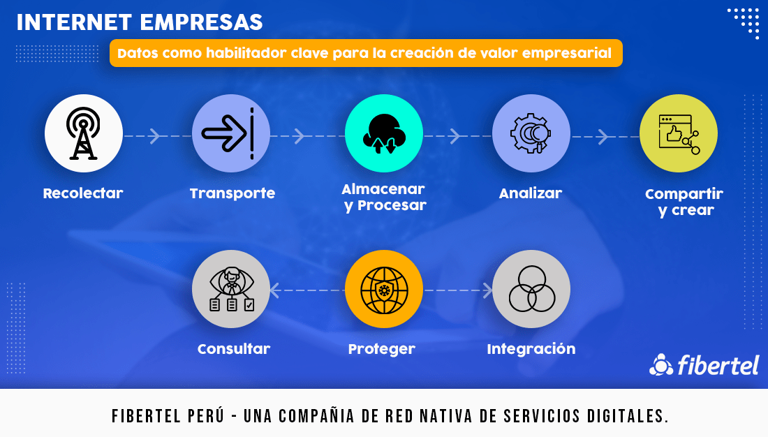Por su propia naturaleza, Internet de empresas produce cantidades gigantescas de datos. Aquí es donde se encuentran los mayores desafíos. ¿Cómo puede administrar, almacenar, analizar y compartir estos datos de forma segura? Aquí hay algunas consideraciones clave: Primero, los datos a menudo necesitan ser administrados en tiempo real cuando se necesitan para la continuidad de las líneas de producción inteligentes y las redes de transporte, por ejemplo, por los ecosistemas empresariales que los respaldan. Un subconjunto de estos datos debe ser en tiempo súper real con una latencia de menos de milisegundos, por ejemplo, autos autónomos que se comunican entre sí e infraestructura en la carretera para detectar un accidente en la próxima esquina En segundo lugar, algunos datos en tiempo real deben almacenarse a lo largo del tiempo para que puedan hacerse referencias cruzadas con otras variables de datos o compararse con el tiempo. Por ejemplo, los datos médicos como las imágenes de resonancia magnética deberán compararse con el tiempo para un solo paciente o diferentes pacientes a nivel global utilizando sistemas de IA de autoaprendizaje Finalmente, estos datos deben analizarse y protegerse con precisión, asegurando el cumplimiento de los estrictos requisitos de cumplimiento, gobernanza, privacidad y soberanía de datos. EL servicio de Fibertel Perú aborda todos estos problemas mediante el uso de activos estratégicos de datos, una amplia experiencia en el campo de los datos. Con el Internet de las empresas no se trata solo de conectar a las personas. También se trata de conectar a las personas con los objetos y, a su vez, de los objetos a los procesos comerciales, incluso aquellos que se extienden fuera del perímetro de la empresa, y también a la infraestructura tecnológica.